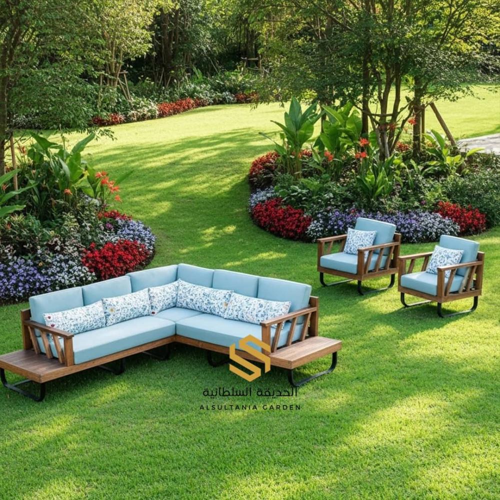 جلسة خارجية خشبخشب قواعد حديدزاويه مقاس 2.5*2.5+كرسيين مفرد مقاس 80 سم +طاولة رئيسة مقاس 1*7تفصيل حسب الطلب