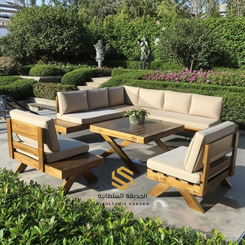 جلسة خارجية خشبخشب سويدي زاويه مقاسمترين ونص في ثلاثة متر+كرسيين مفرد مقاس متر+طاولة رئيسة مقاس متر في متر